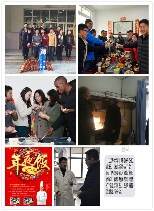 为让留校过年的学生充分感受到学校大家庭的温暖,学校各相关部门和院系都组织开展了一系列迎新活动。后勤集团继续支持开展春节三天留校工作学习的师生到食堂免费用餐活动;社区精心组织中外留校学生集体包饺子活动;党委研工部、社区管理部召开留校学生新春茶话会;校团委到实验室、创业苗圃等处看望假期仍在忙碌的创新创业学生;学工办面向留校学生开展“上大的幸福年味”微信征集活动;机自学院领导和辅导员老师年初二分赴宝山、延长两个校区的学生宿舍给留校学生拜年,为学生及其远方家人带去学校的问候。