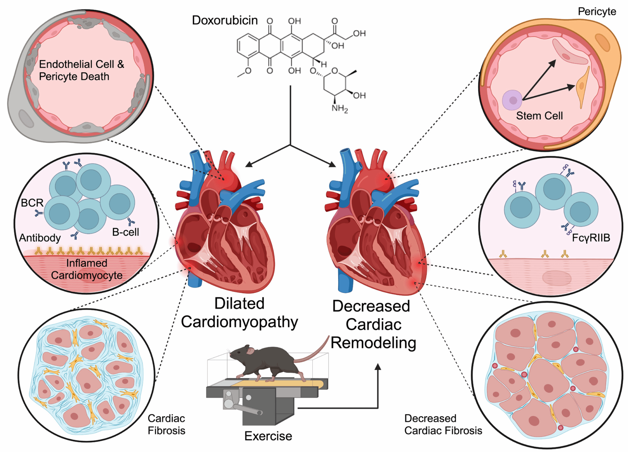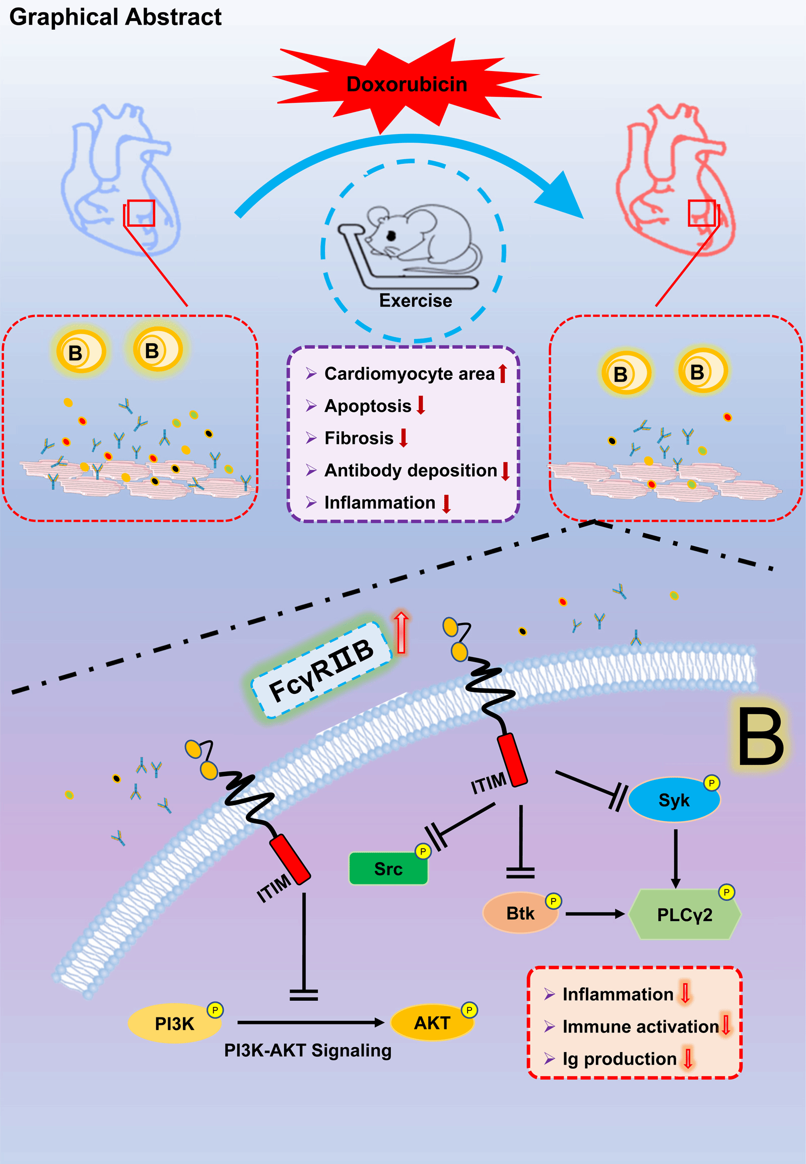 阿霉素(Dox)作为一种有效的化疗药物,其用药过程常常引起急性和慢性心脏毒性,并伴有严重的心脏炎症。运动训练可以抑制Dox引起的心脏毒性,然而,免疫细胞是否参与运动的保护作用尚未明确。该研究发现运动可以有效降低B细胞产生的炎症因子和抗体水平,并且有效保护Dox诱导的心脏毒性。FCγRIIB作为一种重要的B细胞活化介质,能对运动训练做出反应,并调控B细胞参与运动减轻Dox诱导心脏毒性的保护作用。运动通过上调B细胞FCγRIIB的表达,提高B细胞活化阈值,降低B细胞活化水平,进而抑制心脏炎症及心肌损伤,减轻Dox诱导的心脏毒性。
