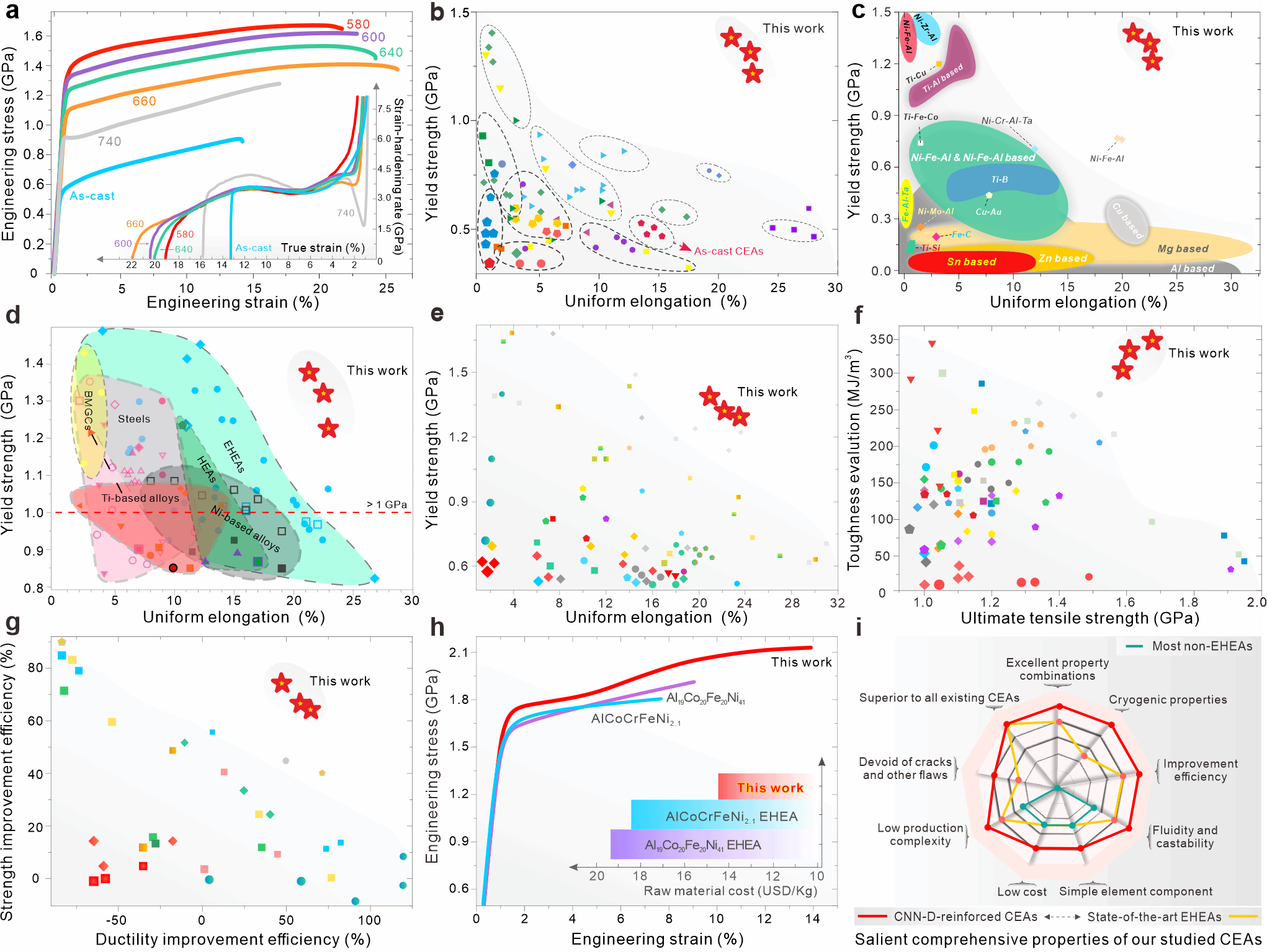 图3蚕茧状纳米位错网结构共晶合金的优异力学性能组合