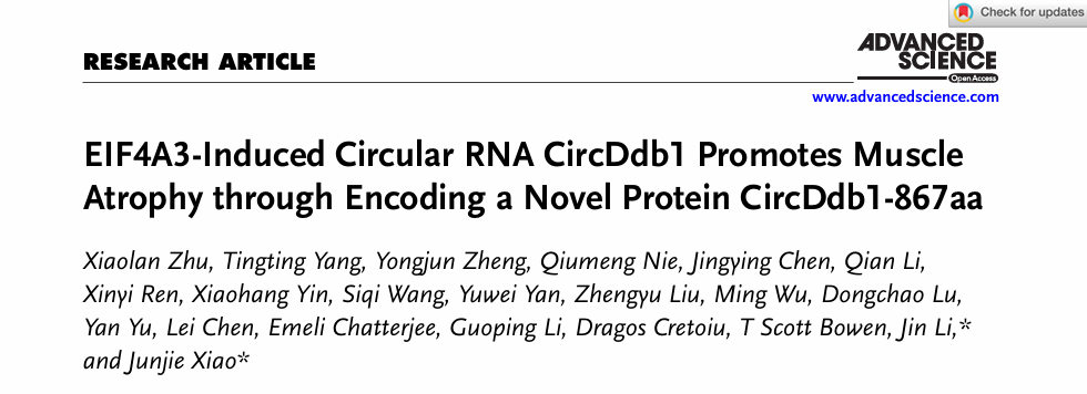 肌肉萎缩是衰老、神经损伤、心力衰竭等多种疾病的常见并发症,目前缺乏治愈的方法。目前关于环状RNA(circRNAs)在骨骼肌萎缩中的作用及机制知之甚少。本研究鉴定了一种保守的环状RNA——circDdb1,其来源于编码损伤特异性DNA结合蛋白1(DDB1)的宿主基因,参与调控肌肉萎缩的发生。体内外实验表明,circDdb1在多种类型的肌肉萎缩模型及人类衰老肌肉中,表达显著上调。进一步研究表明,circDdb1的高表达可导致肌肉萎缩。相反,抑制circDdb1可有效阻止由地塞米松、肿瘤坏死因子α(TNF-α)或血管紧张素II(AngII)在肌管细胞中引发的肌肉萎缩,以及去神经、血管紧张素II和固定引起的小鼠肌肉萎缩。研究进一步发现circDdb1可以编码一种新蛋白——circDdb1-867aa,该蛋白通过与真核延伸因子2(eEF2)的Thr56位点结合并增强其磷酸化水平,抑制蛋白质翻译,进而促进肌肉萎缩。此外,作者发现真核起始因子4A3(EIF4A3)是circDdb1在肌肉萎缩中表达升高的上游调控因子。综上,该研究揭示了circDdb1作为肌肉萎缩的重要调节因子,并提出其为潜在的治疗靶点。