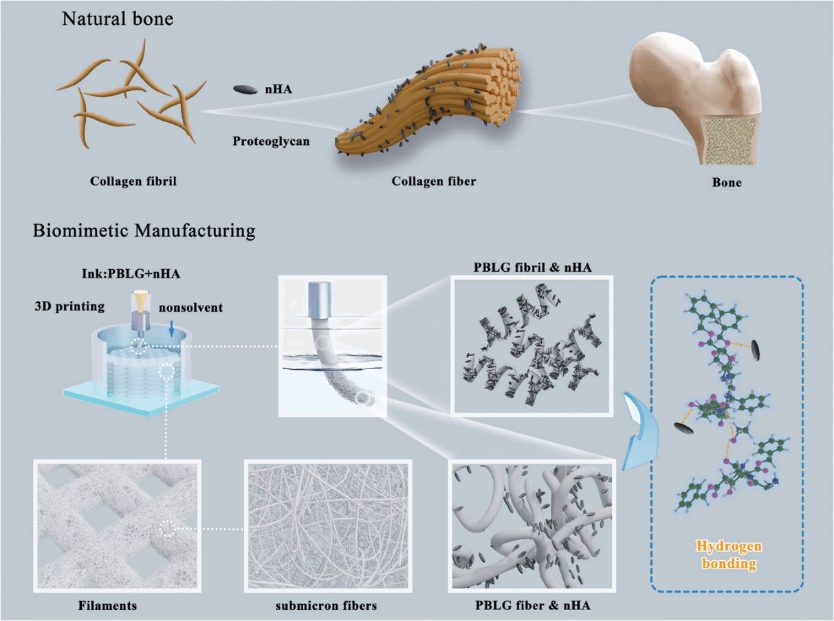 该研究首先揭示了非溶剂致PBLG纤维形成的内在机理,醇羟基介导的分子间氢键相互作用是PBLG原纤维生长成亚微米纤维的重要影响因素。羟基磷灰石纳米颗粒(nHA)与PBLG之间的氢键相互作用促使溶于1,4-二氧六环中的PBLG和nHA混合物表现出优异的可挤出性、自支撑性和可塑性。在乙醇为接收相的辅助下实现了具有仿生纤维结构骨替代物的一步高效制造。值得一提的是,非溶剂诱导的PBLG分子间相互作用力以及nHA与PBLG纤维间的氢键相互作用显著提高了仿生骨替代物的机械性能(36.59 ± 2 MPa)。同时,乙醇作为3D打印接收相,使得本无法挤出打印的PBLG基复合墨水表现出优异的可打印性。