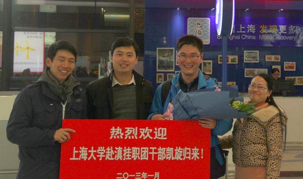 2013年1月18日晚7点,从云南昆明飞往上海的航班顺利在虹桥机场降落,我校赴滇挂职团干部、法学院团委书记高荣飞顺利完成挂职任务抵沪。校团委书记胡大伟以及校团委、法学院老师专程前往机场接机,欢迎挂职团干部凯旋。